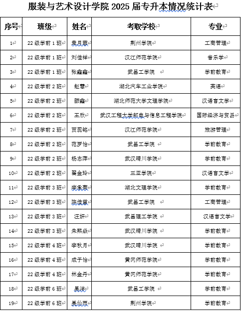 2025年6月,服装与艺术设计学院专升本考试再创佳绩!据统计,今年学院共有66名学子报考专升本考试,19名同学凭借扎实的专业基础和优异的成绩成功考入理想本科院校,升学率达28.79%。这一成绩不仅展现了学院学子的卓越实力,也体现了学院在人才培养和升学指导方面的显著成效。