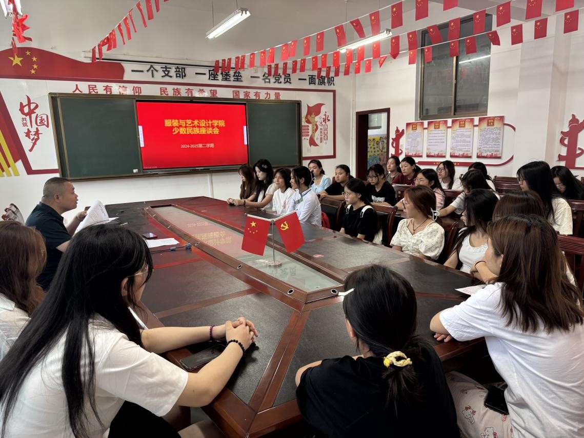 为进一步铸牢中华民族共同体意识,深化民族团结进步教育,倾听少数民族同学心声,营造“手足相亲、守望相助”的温馨校园氛围,2025年5月29日中午,服装与艺术设计学院在1416党员活动室成功举办了以“同心筑梦共话未来”为主题的少数民族学生座谈会。本次座谈会由学院精心组织,旨在搭建沟通桥梁,传递关怀温暖,促进各族学子像石榴籽一样紧紧抱在一起。