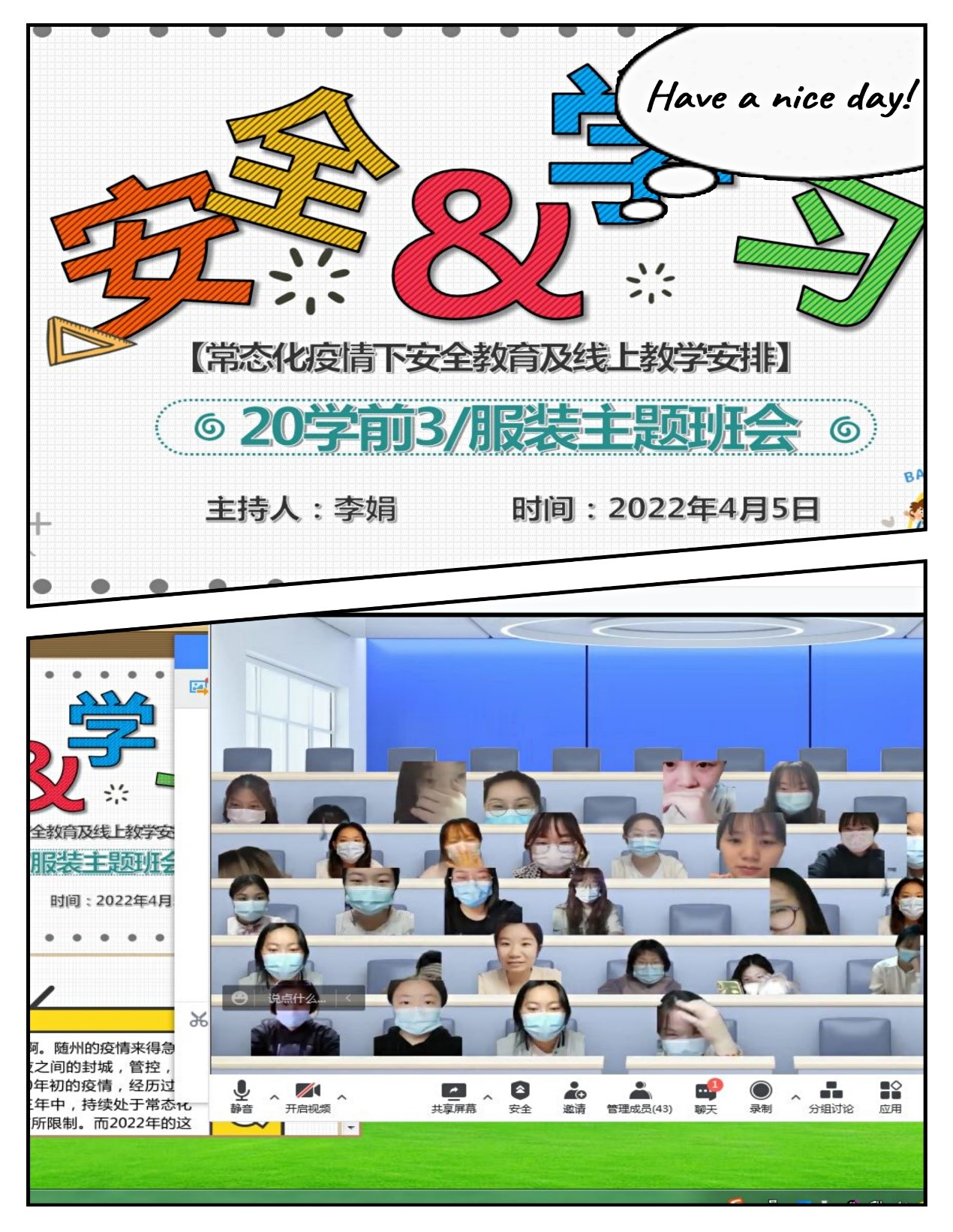 线上教学承载着教师对课堂的严谨和认真,体现着学生的坚持和努力,传递着一种努力向上、生生不息的力量,记录下特殊时期的教师和学生们仍然坚守岗位蓬勃向上的教育和学习热情。一分耕耘一分收获,线上教学我们付出了坚持和努力,收获的是更多的自信、勇敢、坚韧、各项能力和更美好的期待。(供稿人:郭瑞芳)