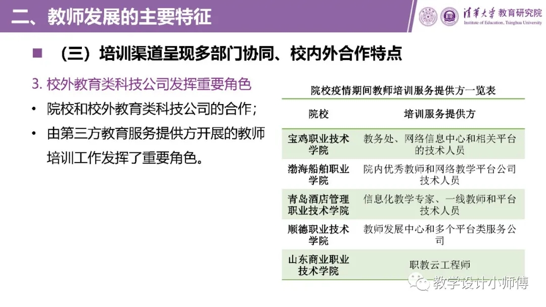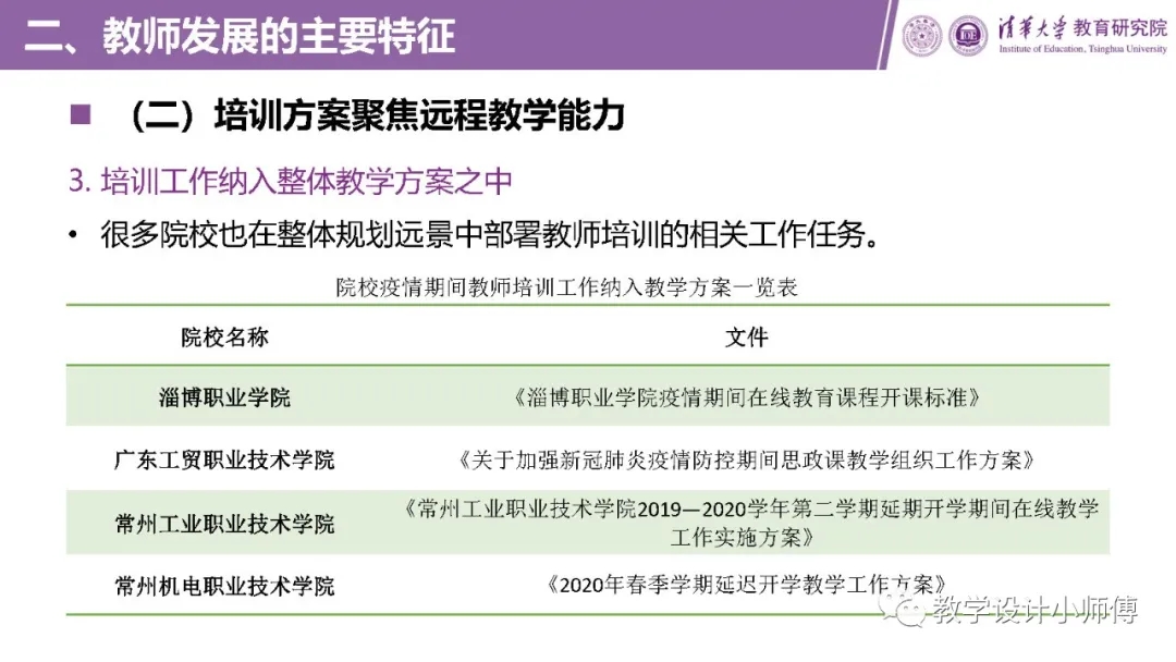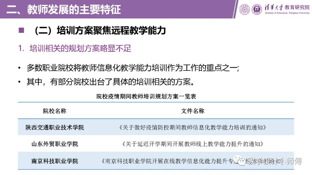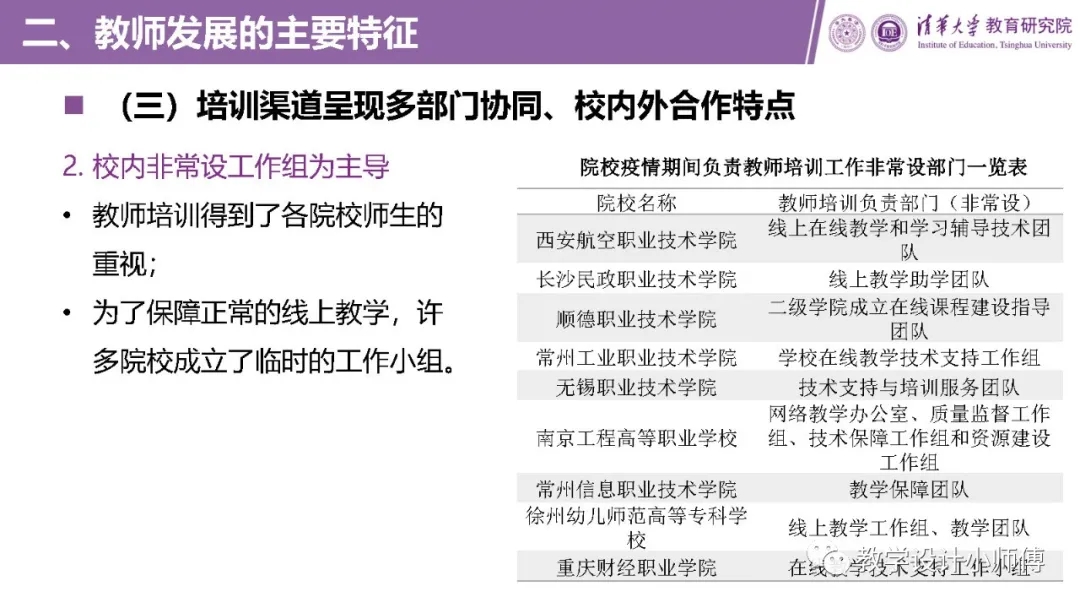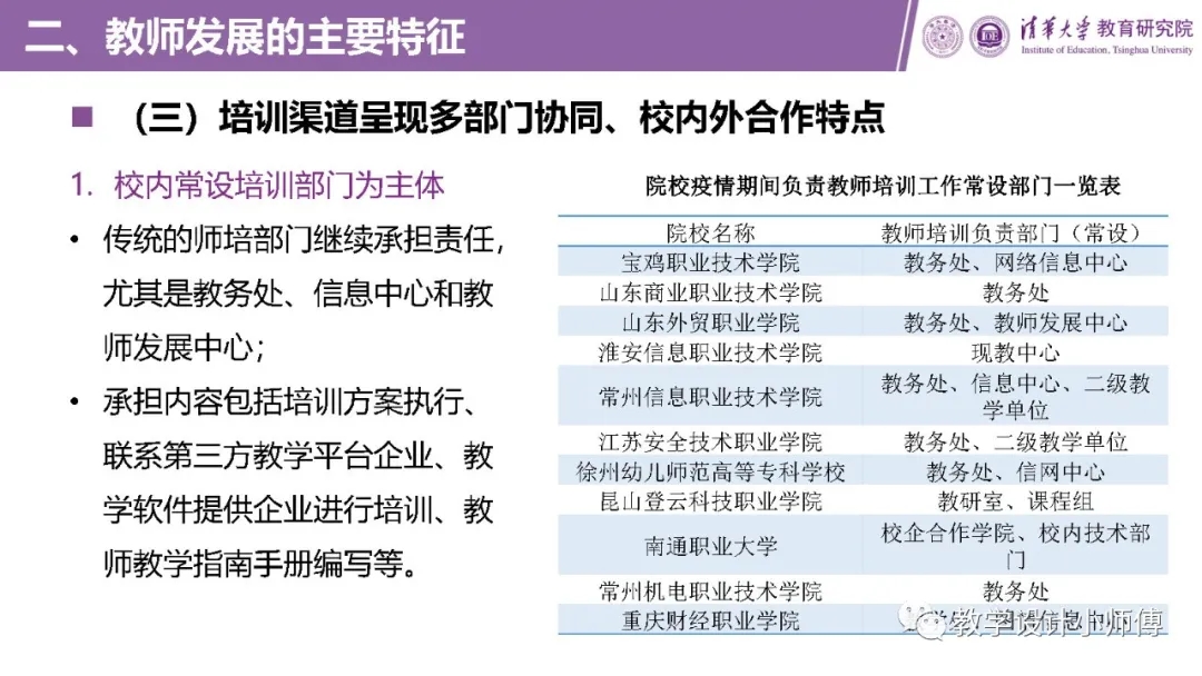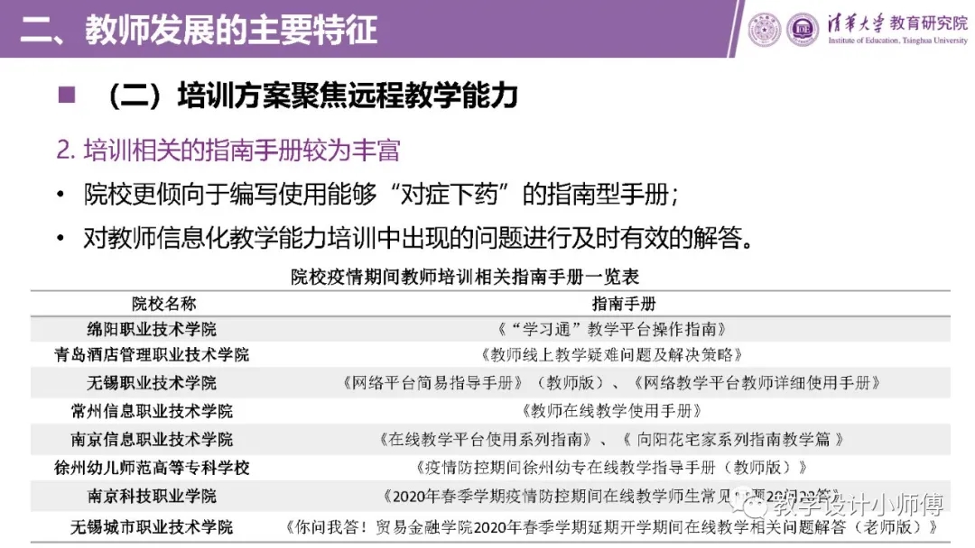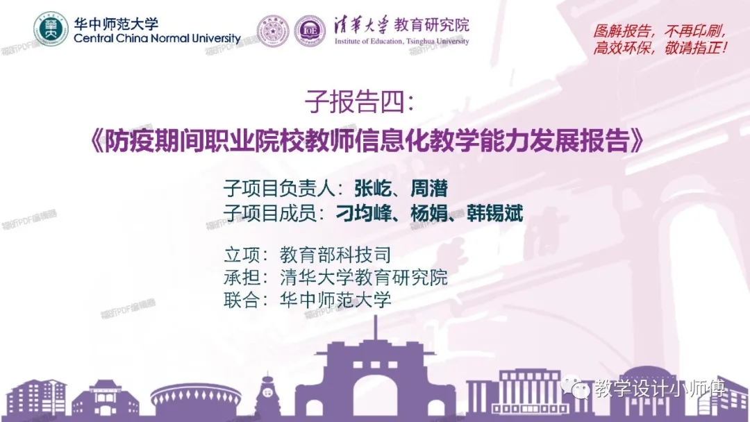 由华中师范大学教育信息技术学院张屹教授、清华大学教育研究院教育技术研究所周潜副所长负责编制的子报告四:《防疫期间职业院校教师信息化教学能力发展报告》近日正式发布。报告调研总结了防疫期间职业院校教师发展的目标、方案、渠道、方式、内容和效果,分析了存在的问题并提出了建议。编制组还包括清华大学刁均峰、杨娟等。