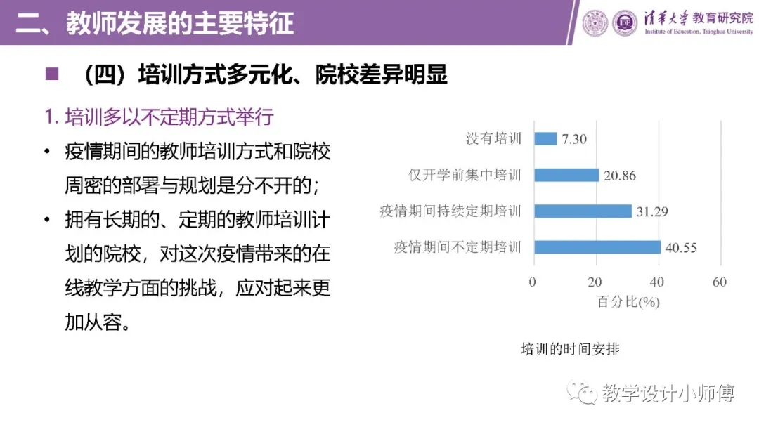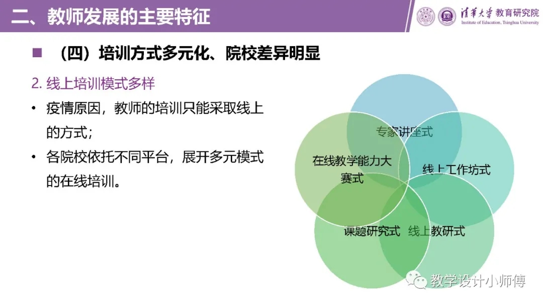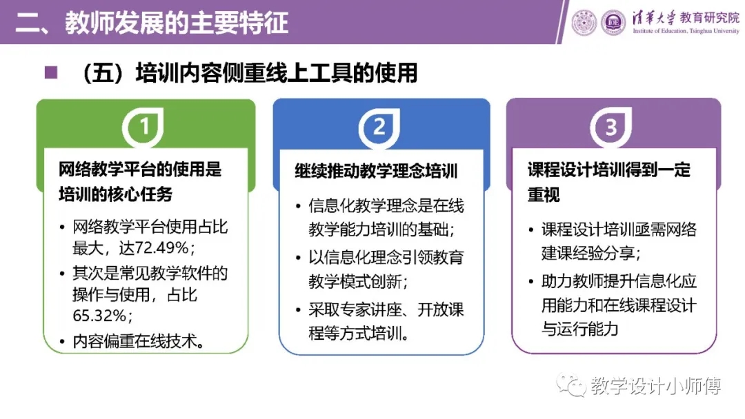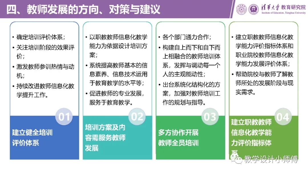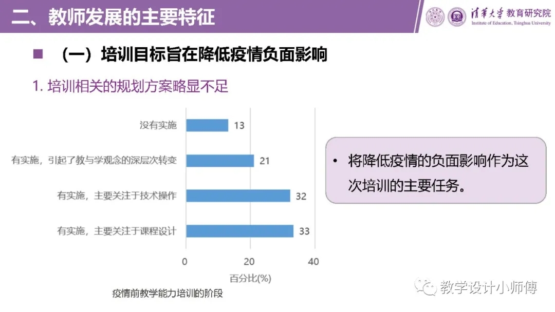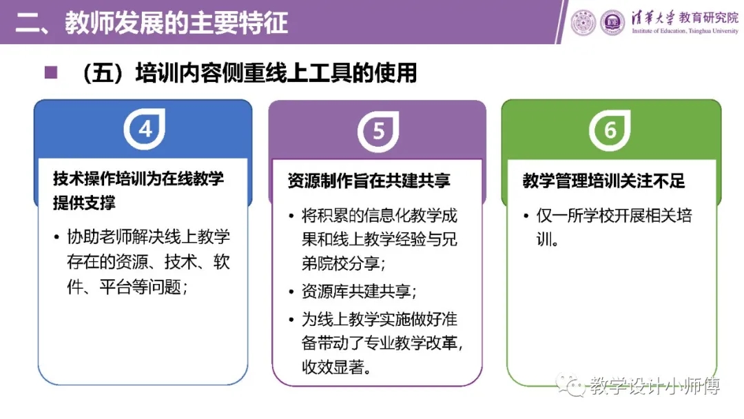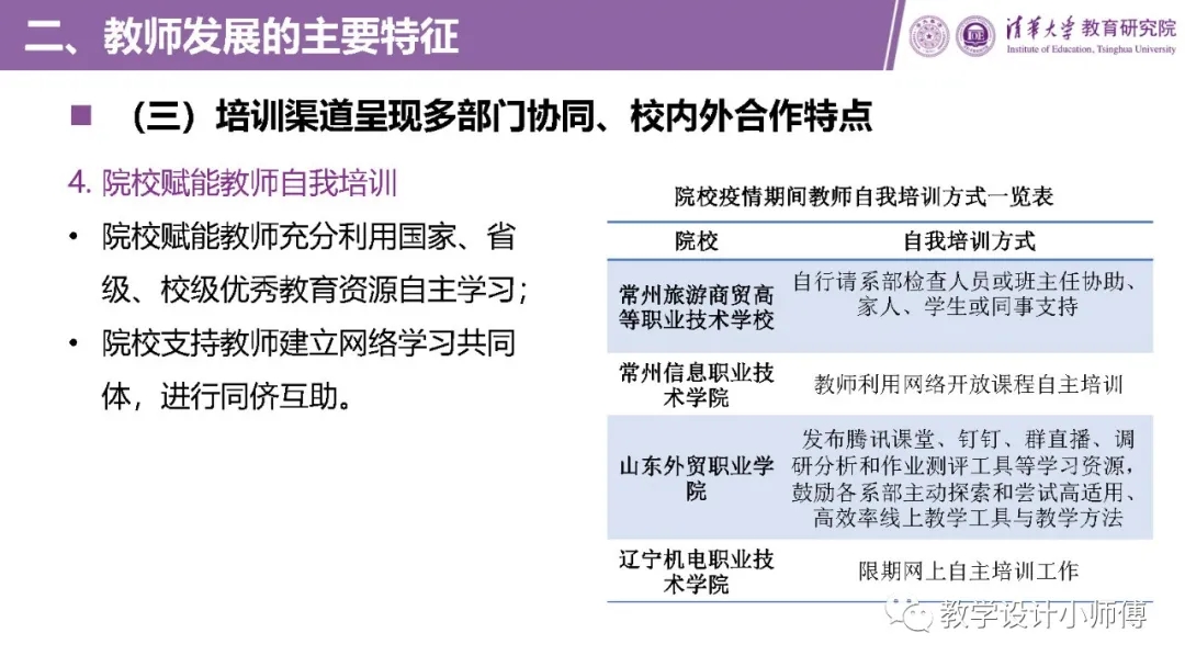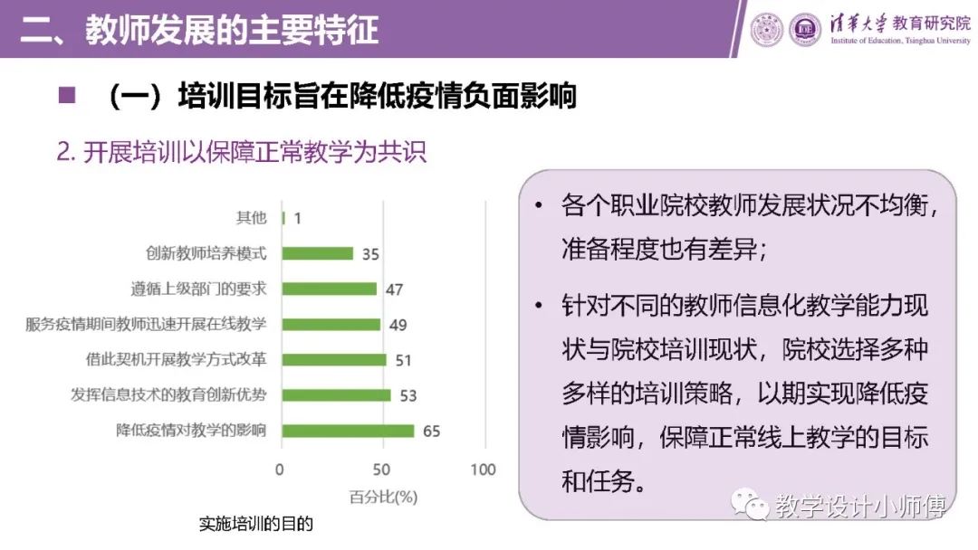 由华中师范大学教育信息技术学院张屹教授、清华大学教育研究院教育技术研究所周潜副所长负责编制的子报告四:《防疫期间职业院校教师信息化教学能力发展报告》近日正式发布。报告调研总结了防疫期间职业院校教师发展的目标、方案、渠道、方式、内容和效果,分析了存在的问题并提出了建议。编制组还包括清华大学刁均峰、杨娟等。