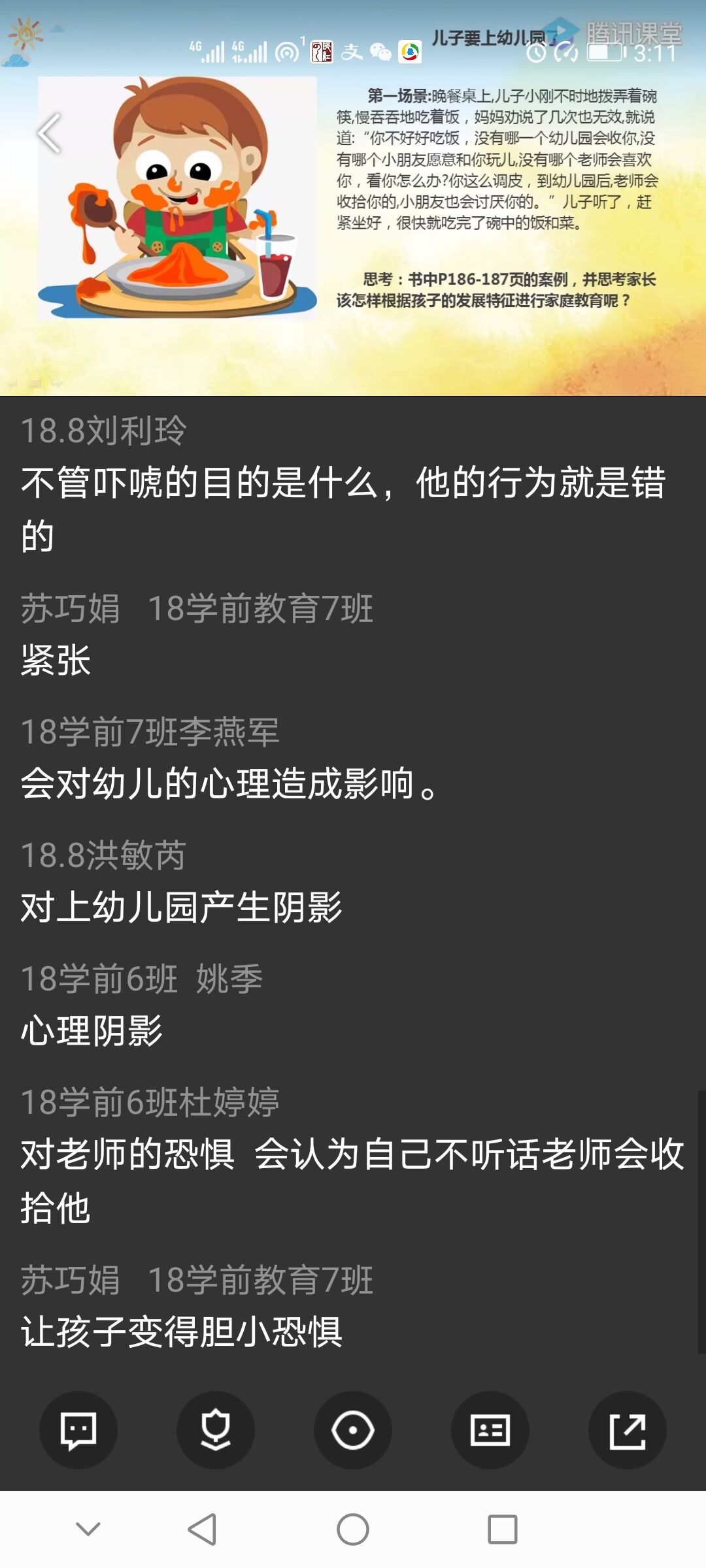 周钰老师授课内容是《学前教育学--学前教育与家庭的关系》,授课平台为腾讯课堂。该门课程是学前教育专业核心课程之一,也是无操作内容的理论课程,相对单调。但周老师在课件中使用了大量的插图,画面活泼生动,同时引用较多案列,带领同学们一起分析,直播间里大家纷纷留言表达自己的看法,与老师形成良好的互动。(张峥峥供稿)