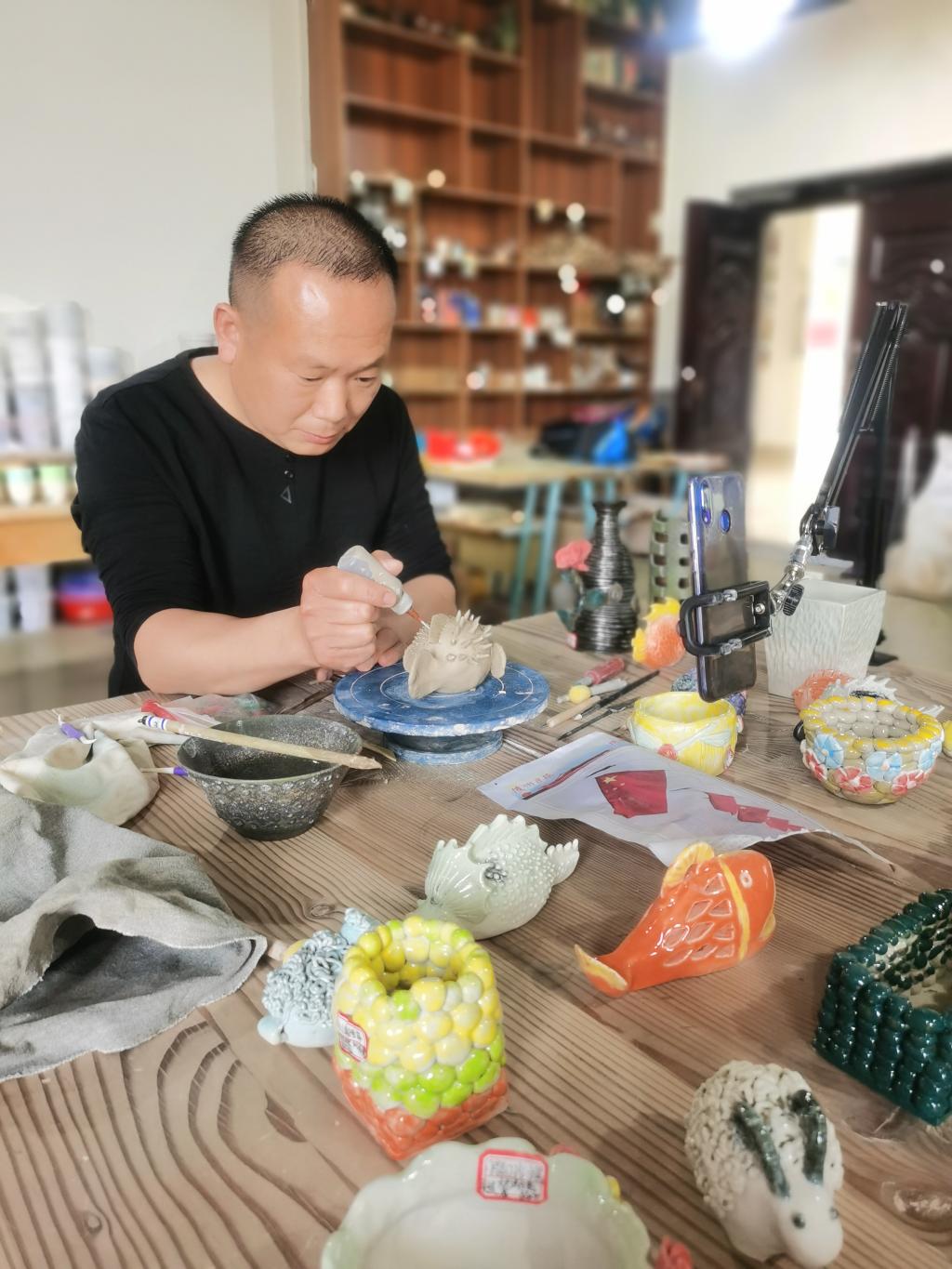 程义文老师的课题为《捏雕成型--泥球成型》,该门课程授课平台为腾讯课堂,授课地点在陶艺工作室。考虑到学生在家,没有操作条件,程老师在教学中反其道而行之,直播中一边操作示范一边详细讲解制作过程和要点,在布置作业的环节,却是让学生回忆操作过程,简述泥球成型的过程和要点,培养学生的活动组织的能力。
