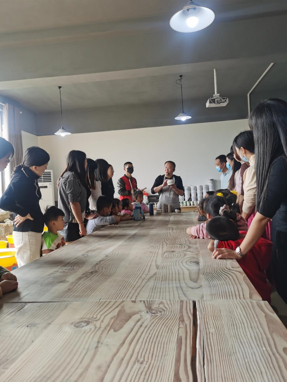 9点左右开始互动体验,首先由舞蹈专业教师杜紫薇带领18级学前2班的同学,给来访的幼儿园小朋友们上了一堂儿童舞蹈课;接着跟随音乐教师施素雅一起玩音乐律动游戏,用肢体动作来表现音乐节奏的变化;最后由陶艺教师程义文带领大家体验陶艺制作乐趣。