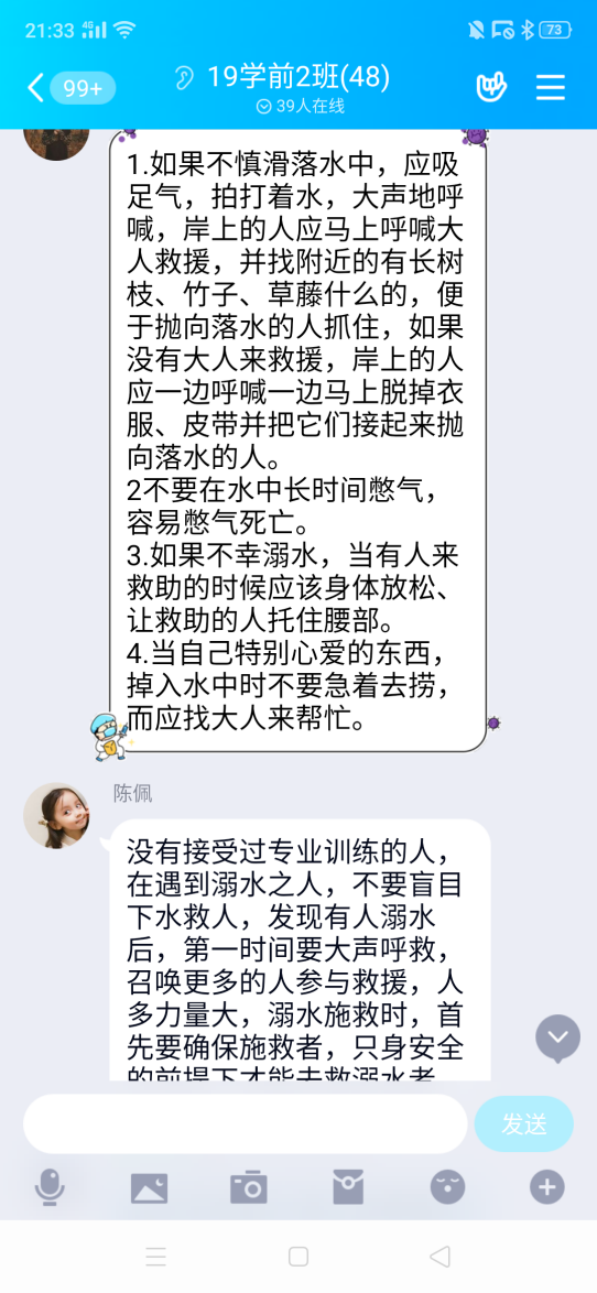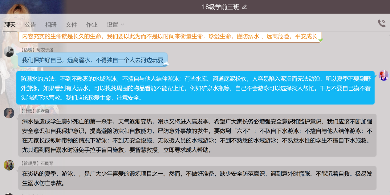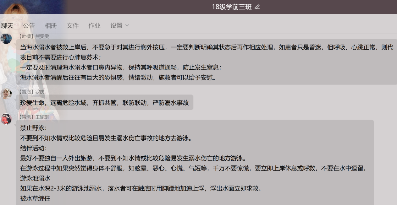各班通过微信群、QQ群开展“云”班会,以观看相关视频、线上讨论、线下制作手抄报等形式,围绕珍爱生命、提高安全意识,提高防溺水意识展开班会。通过这样的形式使广大师生保持高度的安全警惕性,杜绝到陌生复杂水域游泳、戏水,遇到险情,掌握科学救助知识,确保不发生溺水安全事故。(周钰供稿)