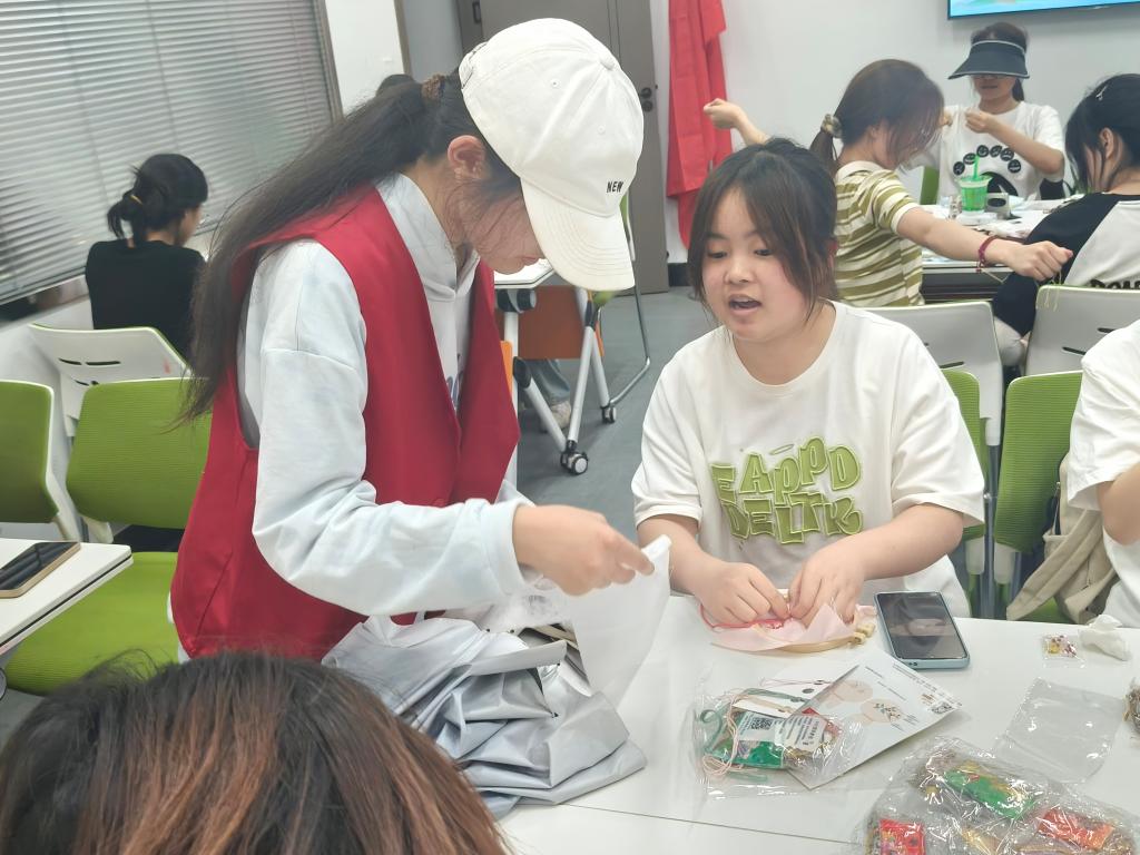 在香囊制作环节,同学们围坐在一起,挑选自己喜爱的香料和精美的香囊布料。现场气氛热烈而温馨,大家相互交流,分享着自己选择香料的理由和对香囊的期待。在服装专业学生的志愿服务指导下,同学们穿针引线,小心翼翼地将香料装入香囊,一针一线都倾注着对自我的关爱与呵护。原本普通的布料,在同学们的手中逐渐变成了一个个色彩斑斓、香气四溢的香囊。