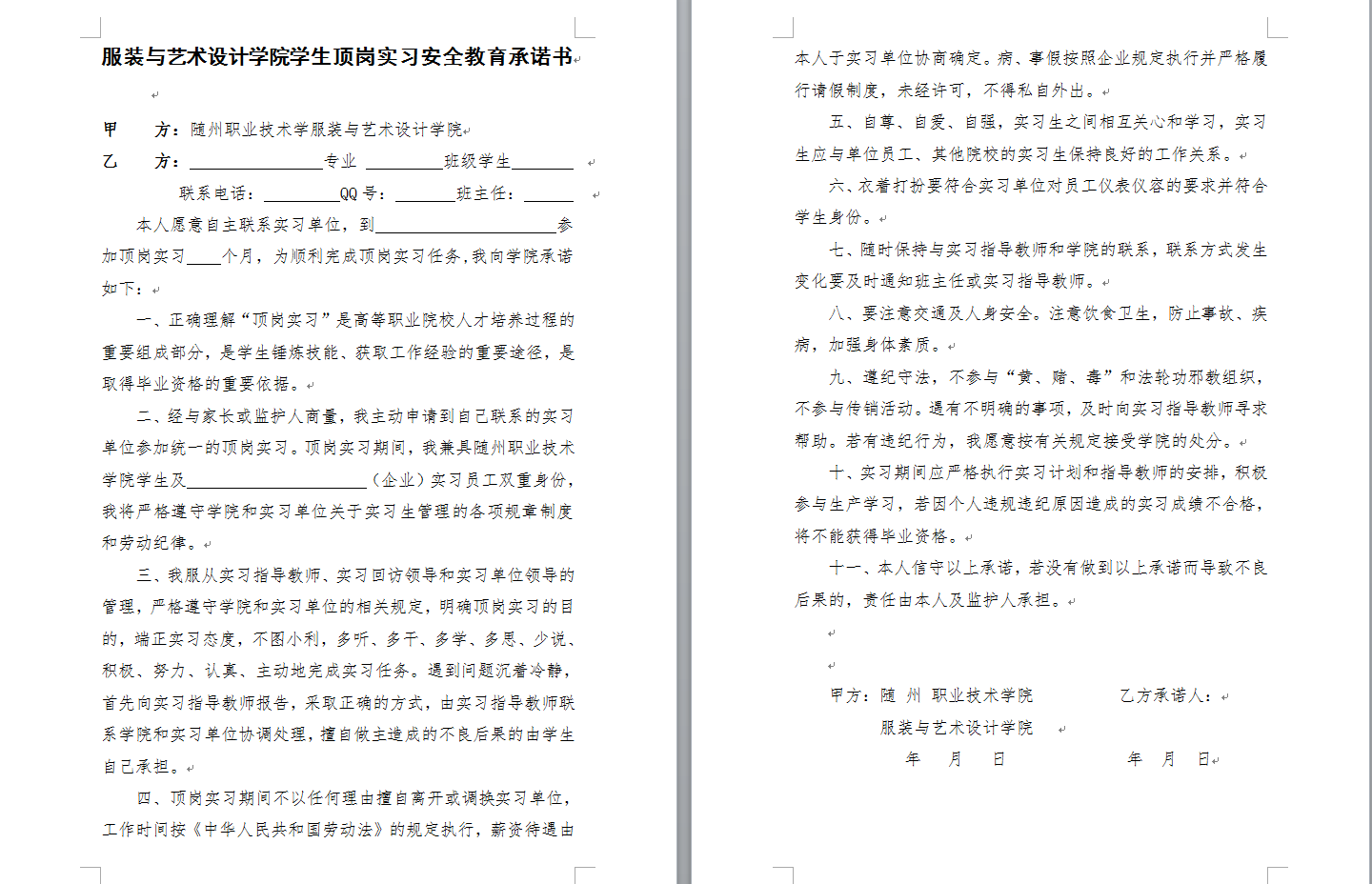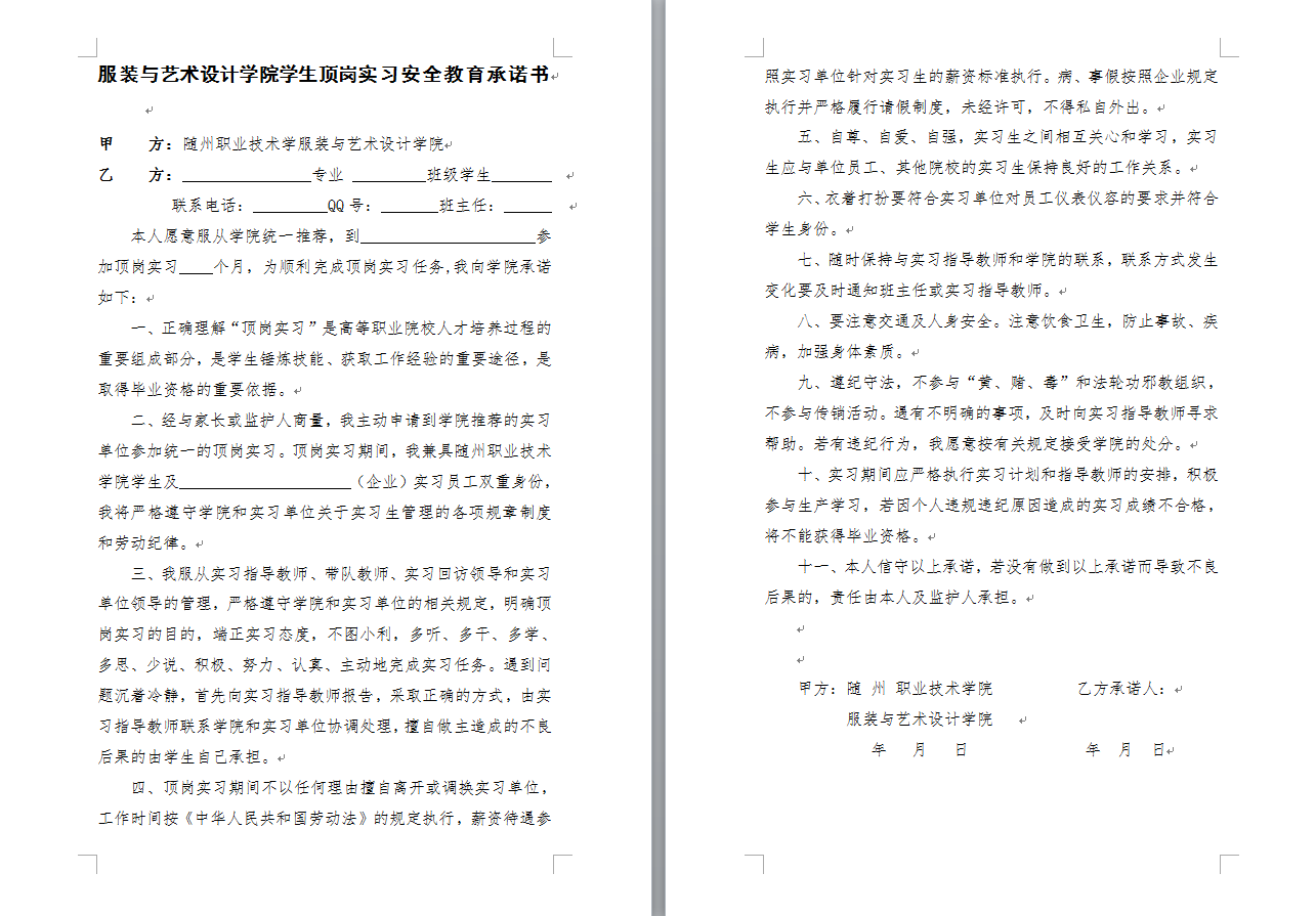 服装与艺术设计学院学生顶岗实习安全教育承诺书