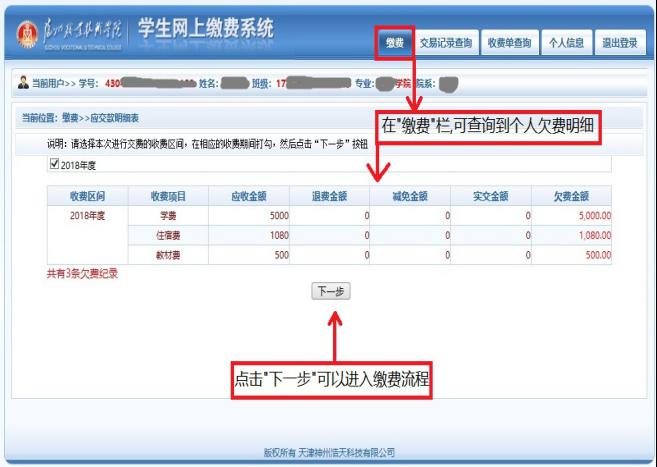 第四步:进入“缴费”栏,查询个人学费的欠费明细。