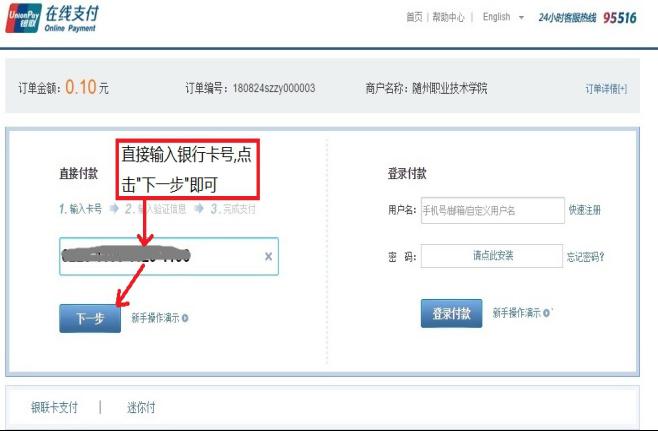 第八步:进入“银联在线支付”,输入交费的银行卡号。