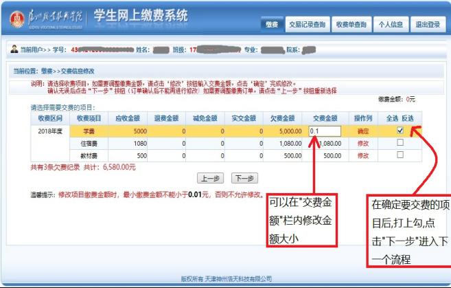 第五步:选择收费项目,如需调整缴费金额,可在相关栏目做调整。
