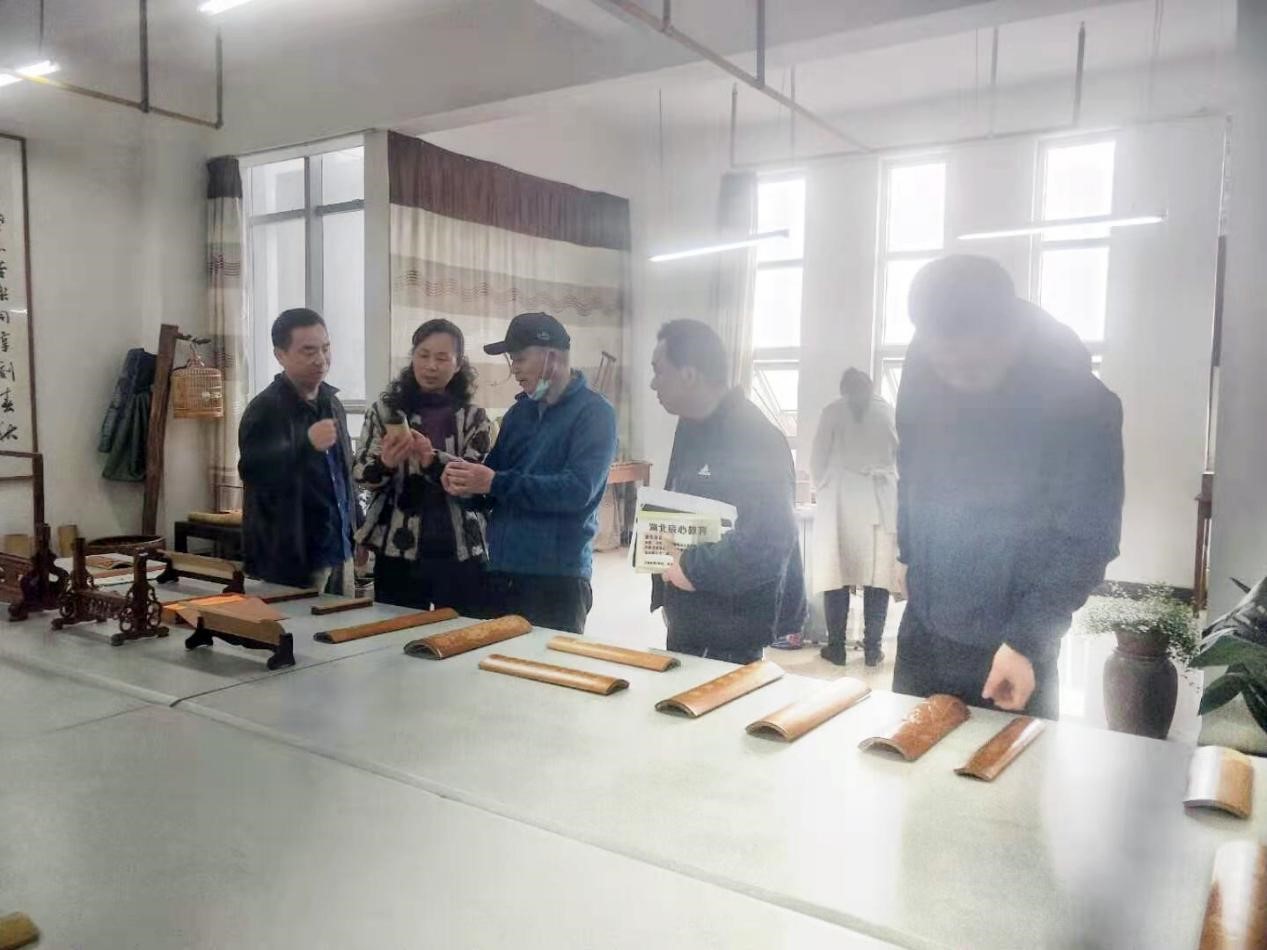 在服装与艺术设计学院钟守兵院长的陪同下,王馆长一行前往图书馆竹刻艺术工作室进行了考察活动。在竹刻艺术工作室,由竹刻教师席宏文向王馆长一行展示并详细介绍了其留青竹刻作品,王馆长对采用纯手工在不足1毫米薄薄的竹皮上以雕刻方式再现书画艺术予以了高度评价,肯定了留青竹刻的艺术价值和文化传承价值,并对服装与艺术学院席宏文留青竹刻申报曾都区非物质文化遗产项目予以了初步认定。