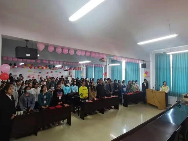 首先主持人致开场词,全体师生唱共青团团歌,然后第十一届学生会主席舒心做学生会年度工作总结。随后由各位老师为学生会干部颁发荣誉证书和聘书,后举行交接仪式并由第十二届学生会主席谭晶晶、第一届学工助理部主席周静逸带领学生会成员宣誓。最后在张亦飞老师讲话下,换届大会完美闭幕。