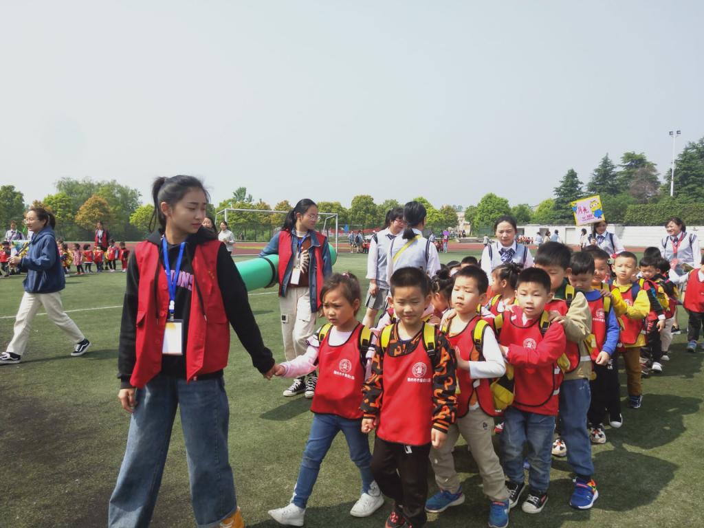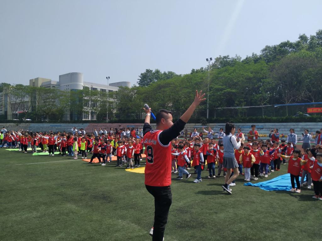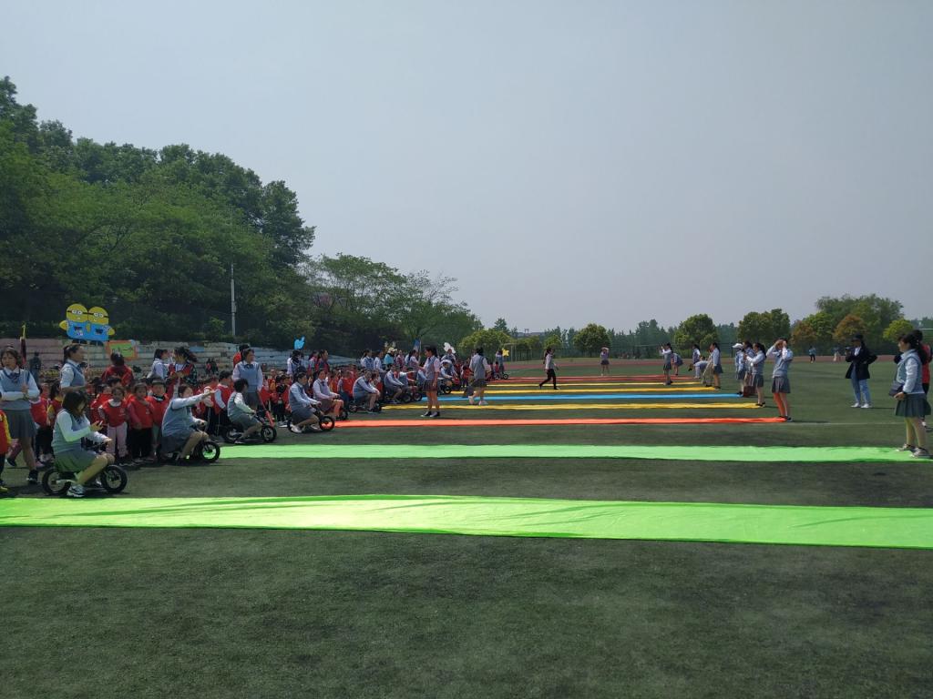 随后在志愿者和老师们的带领下,这些小朋友们安静有序的通过了教学区域,一起来到足球场。在这里,志愿者和老师们带着小朋友一起做操,进行短跑接力赛以及平衡车接力赛等活动,大家都玩的很开心。