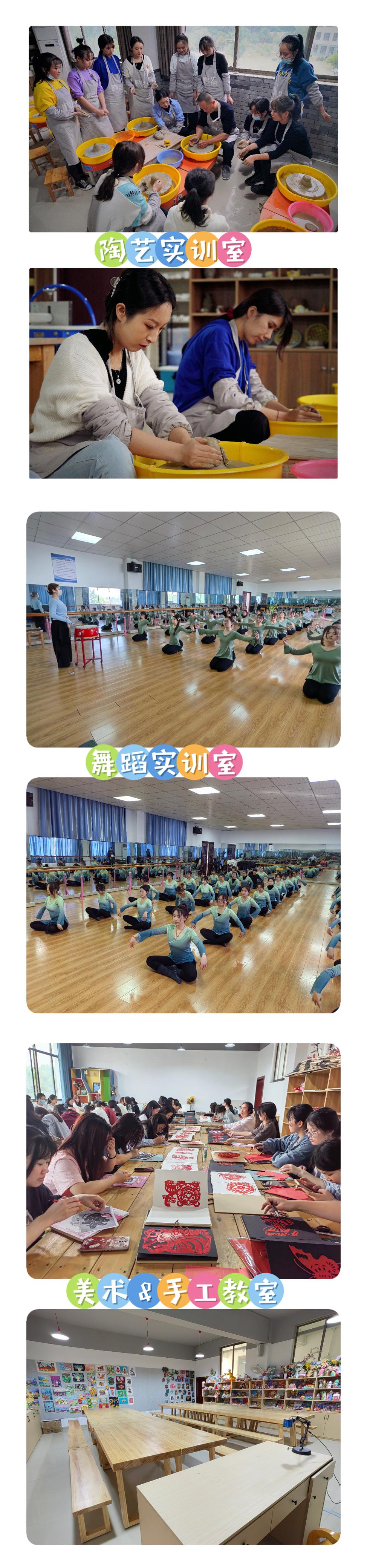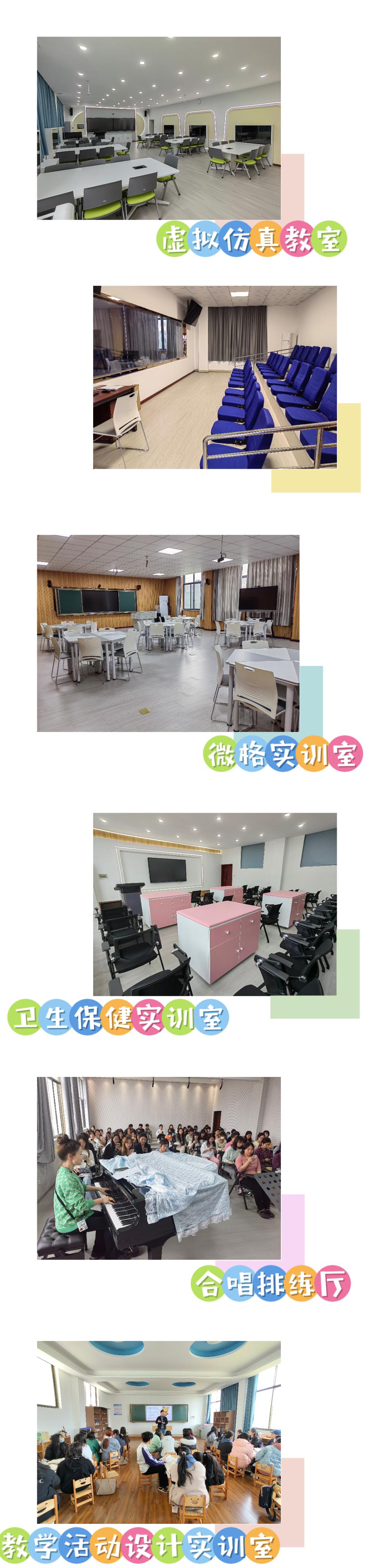 本专业针对技能课程建有形体训练室2个,独立琴房36间,钢琴48余台,数码电子钢琴教室3间,幼儿活动设计实训室2个,幼儿卫生保健实训室1个,专业画室4个,手工制作室2个,陶土制作室1个,名师工作室4间。除此之外,本专业针对学生考证和就业实操还兼有微格实训室、虚拟仿真实训室,2023年还有科学活动设计实训室、奥尔夫音乐实训室、幼儿感统实训室都已通过计划申报,即将建设投入使用。